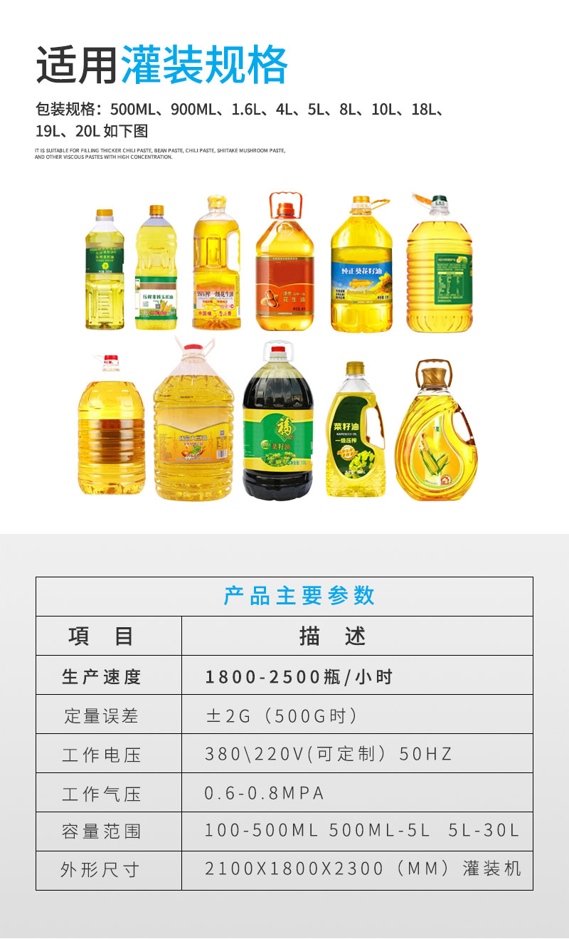 全自動食用油灌裝生產線根據用戶需求非標定制,灌裝部分為八頭灌裝機,適用于不同瓶子的灌裝,配備壓蓋機和貼標機,自動化程度高。